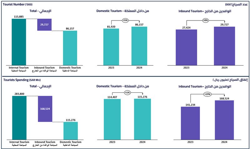 وشهدت السياحة من الخارج نمواً بنسبة 8% في عدد الزوار، 19% في الإنفاق، مقارنةً بعام 2023، متجاوزةً بذلك مستويات ما قبل جائحة كوفيد-199، وكان لتسهيل إجراءات إصدارِ التأشيراتِ الإلكترونية، دورٌ بارزٌ في جذبِ أعدادٍ متزايدةٍ من الزوار، إذ شكّلت السياحة غير الدينية نحو 59% من إجمالي السياحة من الخارج.